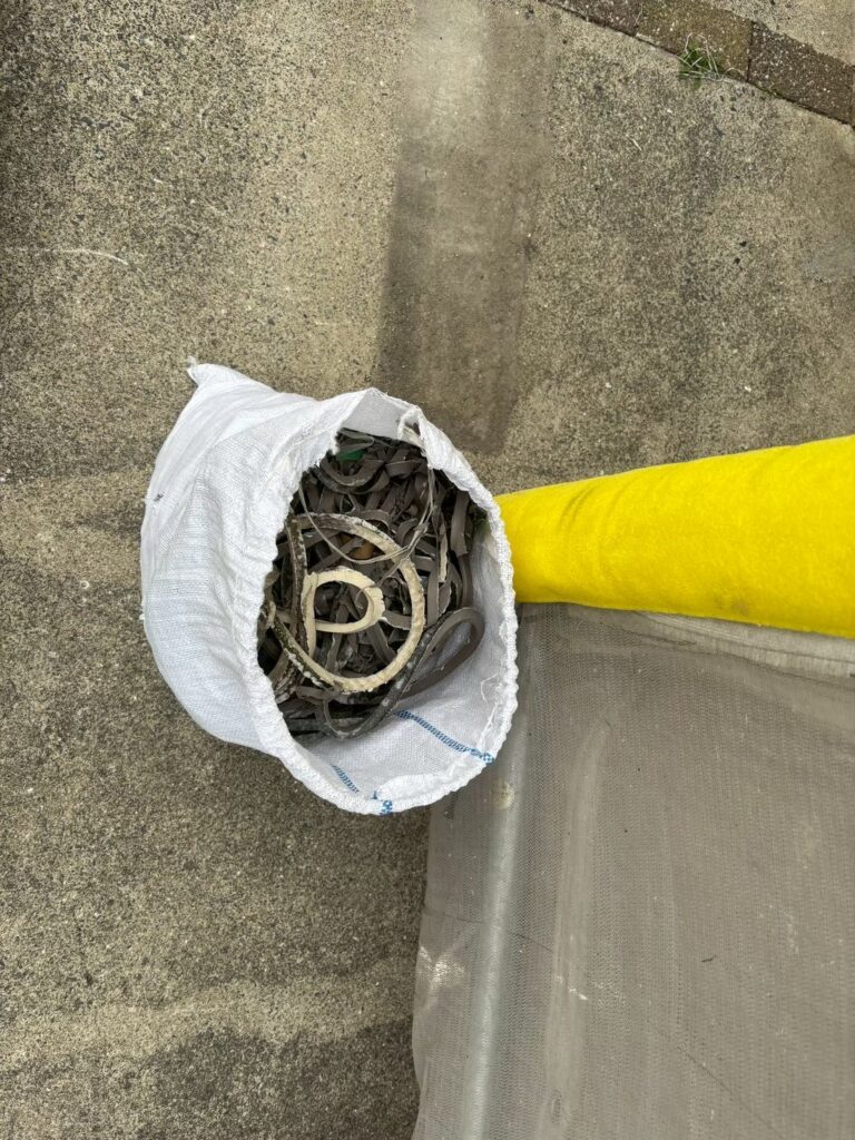 こちら撤去したシーリングの写真です。袋一杯分になります。明日からは養生してシーリング部分の下塗りに入ります(*´▽`*)  石材が吹付けしてる現場の目地の撤去は腕が痛い・・・