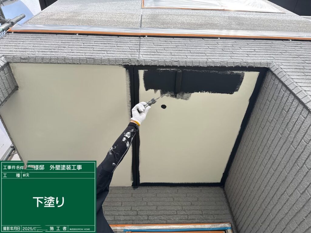 今回の現場では、軒天部分の下塗りと上塗りを丁寧に施工しました。