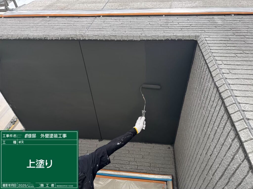 本日は軒天の塗装を行いました!!軒天は指定がなければ白系の色(N-90)を使用する事が多いのですが、最近は外壁の色を黒系の色を選ばれる際には軒天にも黒を使用する事が多くなってきました!