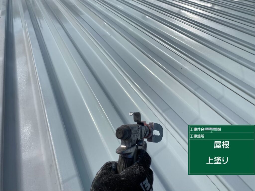 現場はガルバリウム鋼板屋根の建物で、本日は上塗り作業を行いました。