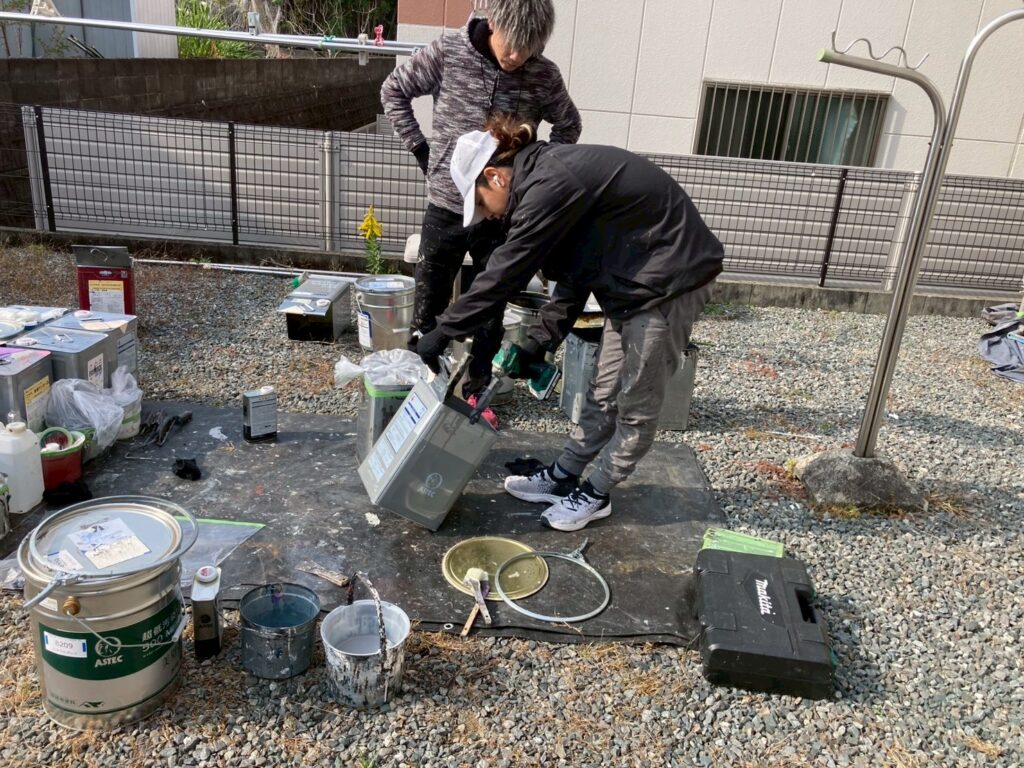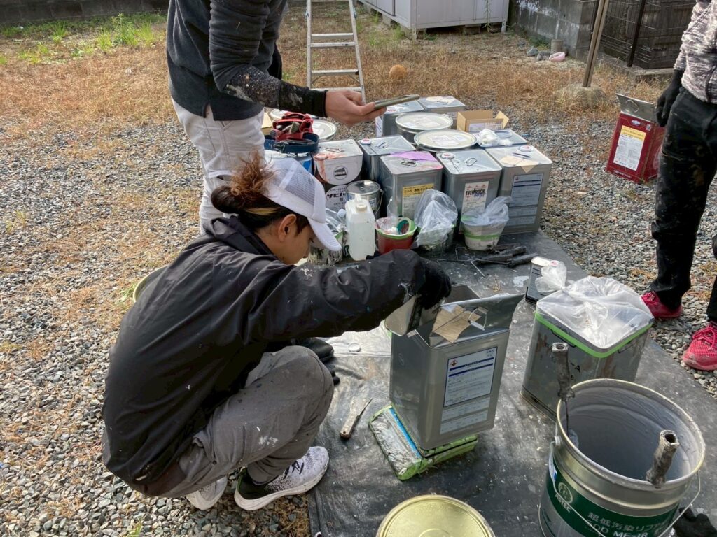 今回使用する塗料は二液タイプの水性無機フッ素塗料です。主剤に硬化剤を加えて塗装していく必要があります!写真は硬化剤を加えている所です。しっかりと量りながら規定の分量を加えていきます。
