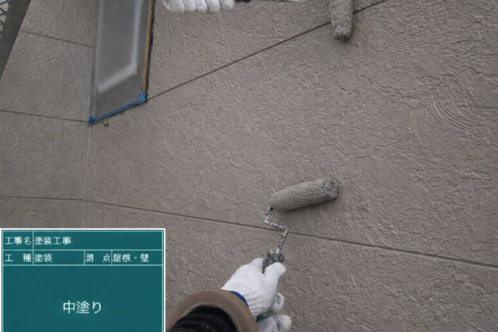 まず下塗りです。下塗りは上塗りの外壁材の接着剤のような役目を持ち、塗装後の耐久性を左右する重要な工程です。下塗り材を均一に塗布し下地の吸い込みを安定させ、後の塗装が美しく長持ちする状態を整えます。下塗り乾燥後、中塗りを行います。中塗りは下塗りで整えた外壁に仕上げ塗料を塗り雨風や紫外線から建物を守るための中間層を形成します。色の密度を整え、仕上げのために最適な状態にしていきます。中塗り乾燥後、上塗りを行います。最終的な色合いや質感をつくるために仕上げ塗料を均一に塗装し、美観と耐候性を兼ね備えた外壁へ仕上げていきます。